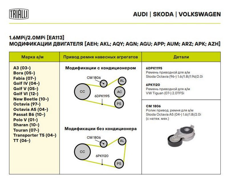 Артикул.1: CM 1806 Ширина, мм: 24 Количество на автомобиль: 1 Товарная линейка: BLACK Гарантийный срок: 2 года/60 000 км. Особенности конструкции: механизм натяжения приводного ремня Сопутствующие товары: 6DPK1195, 6PK1120 Внутренний диаметр, мм: 12 Внешний диаметр, мм: 70 Сопутствующий товар: Ремни: 6DPK1195, 6PK1120